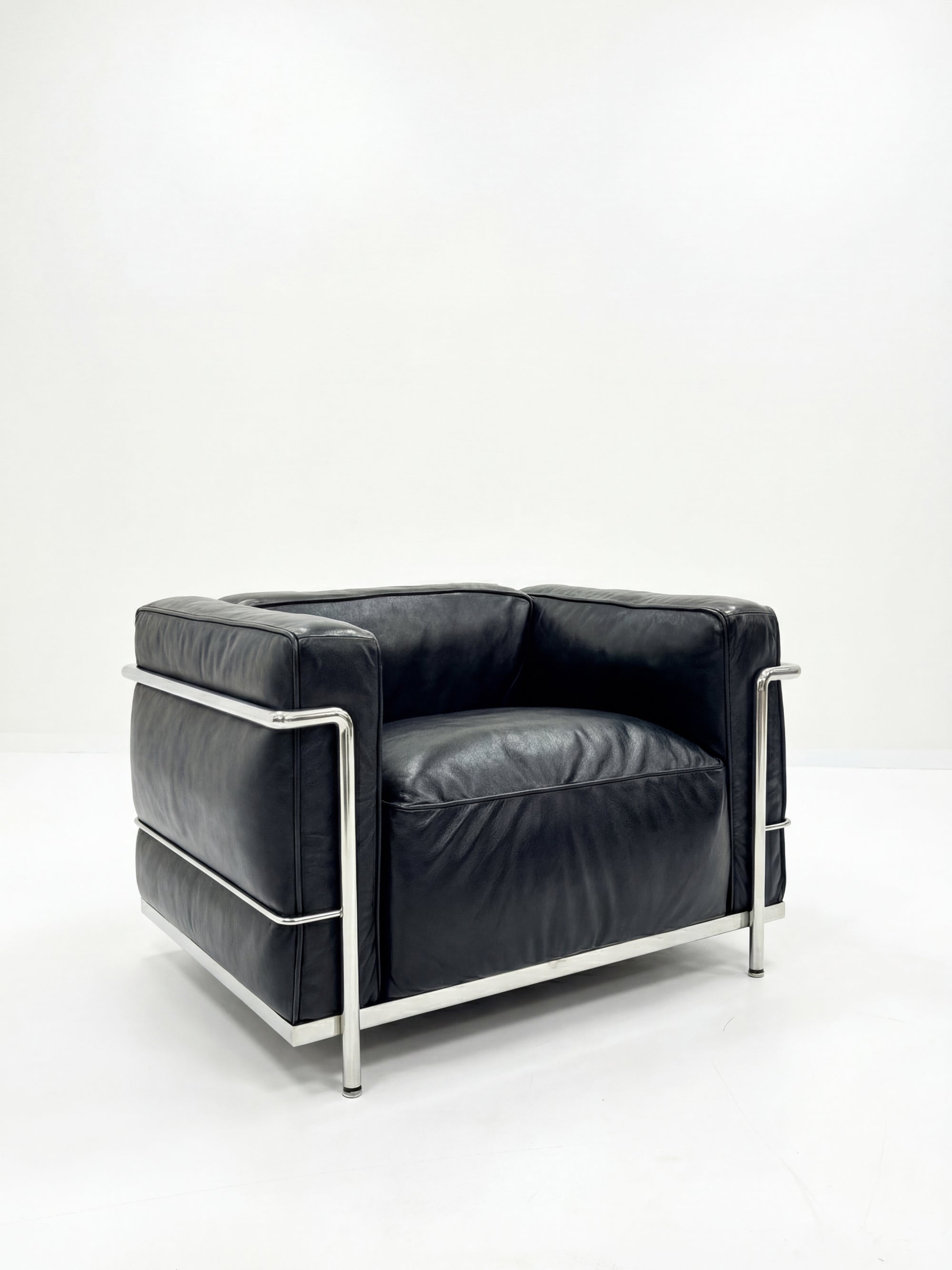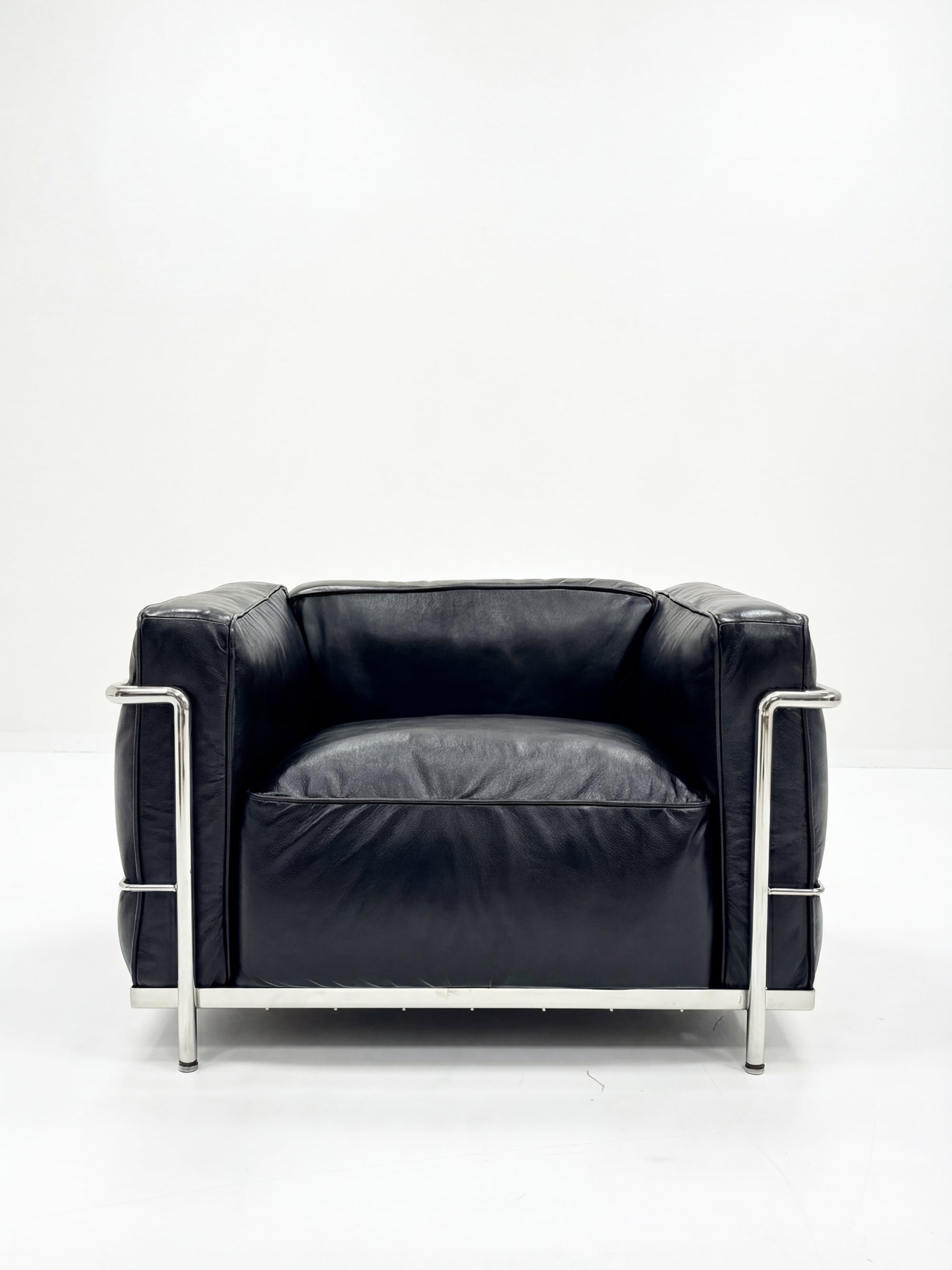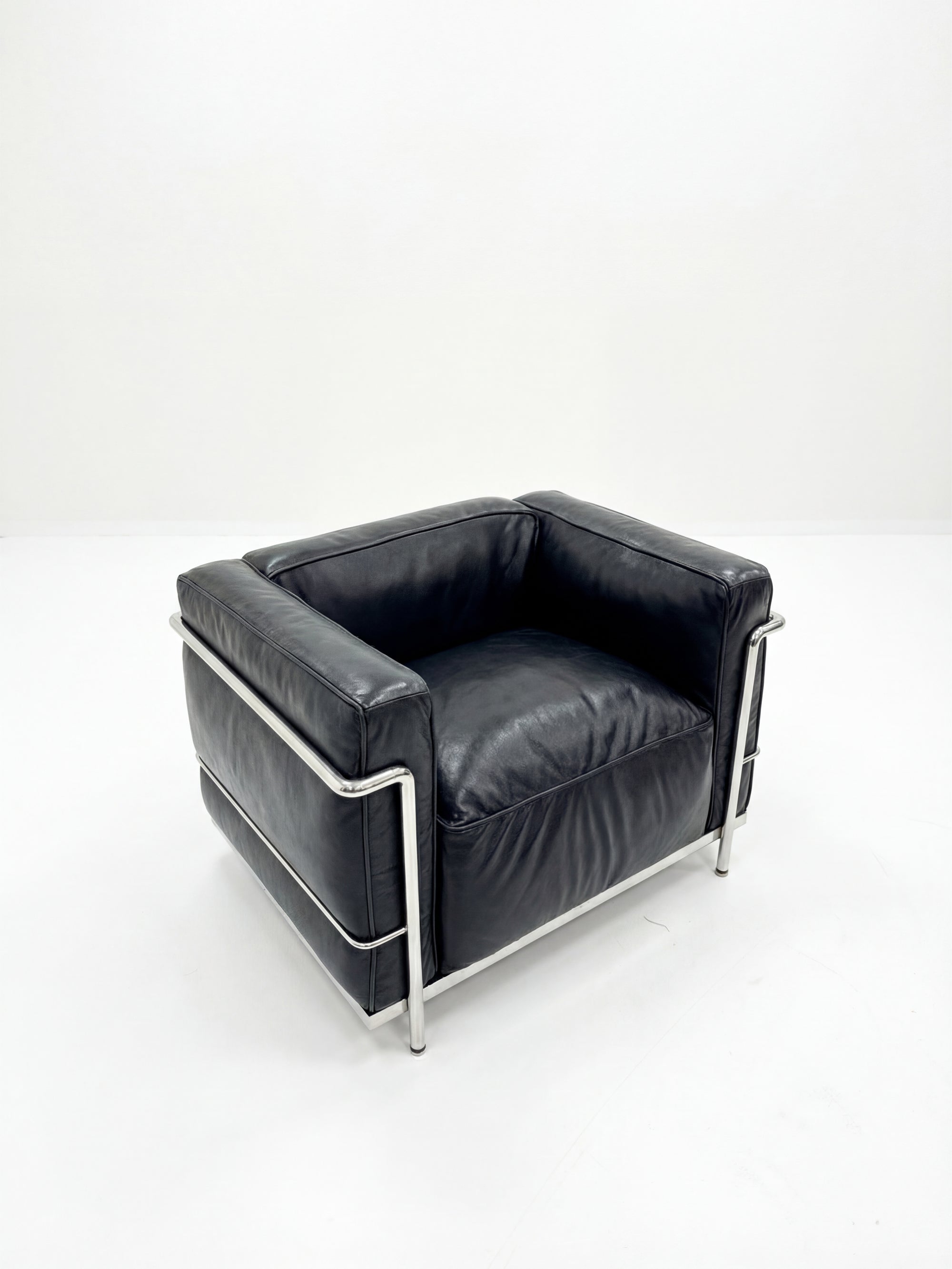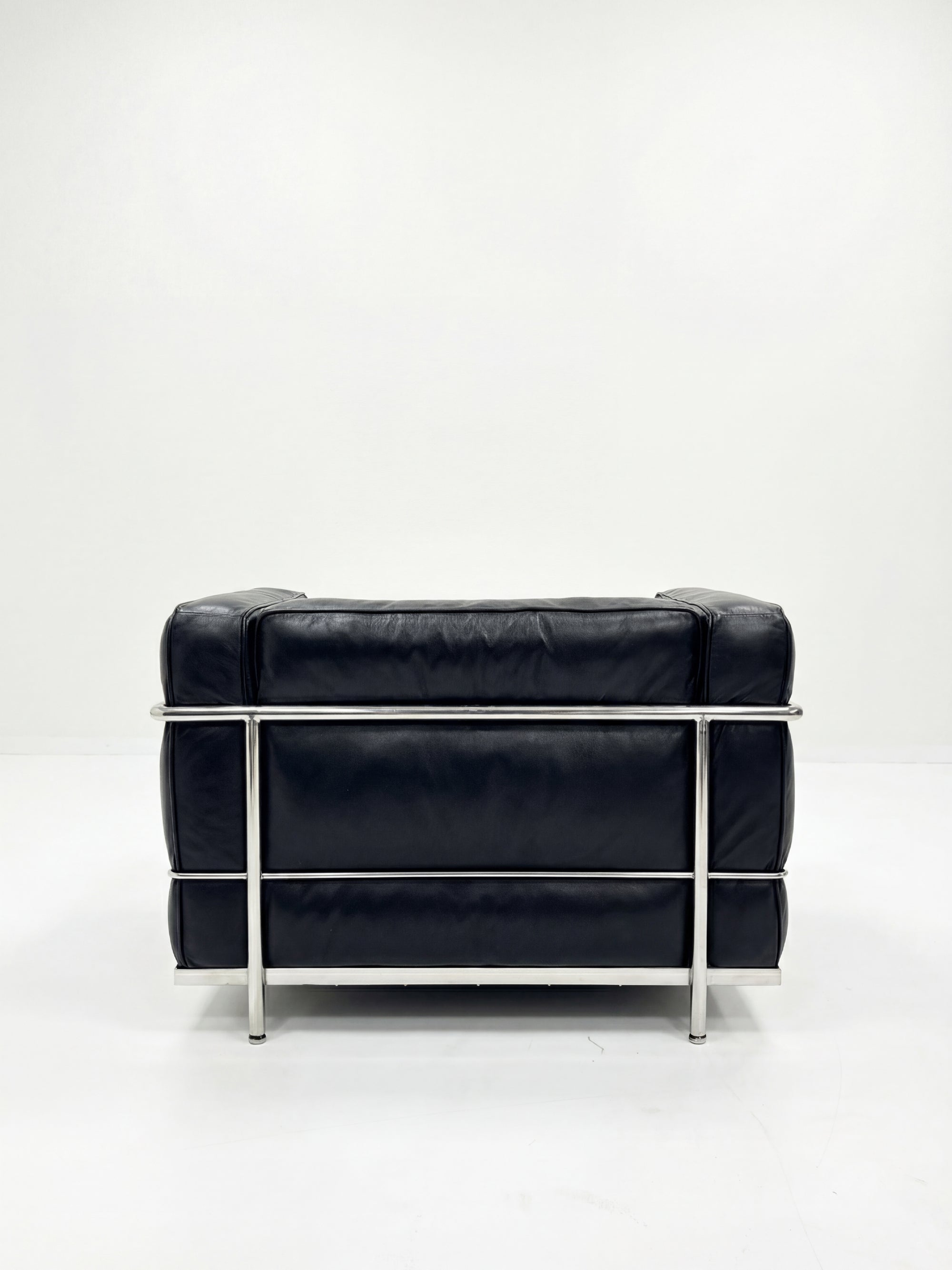 Une silhouette cubique, un confort sculptural, un hommage à l'architecture intérieure moderniste. Ce fauteuil Grand Confort associe la rigueur d’une structure en acier chromé à la douceur du cuir pleine fleur noir.