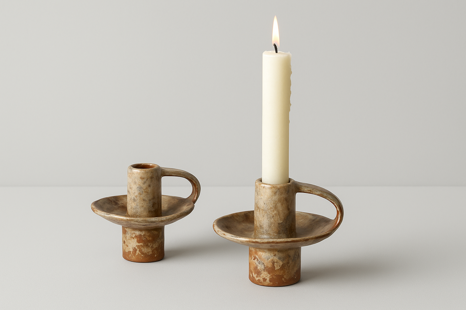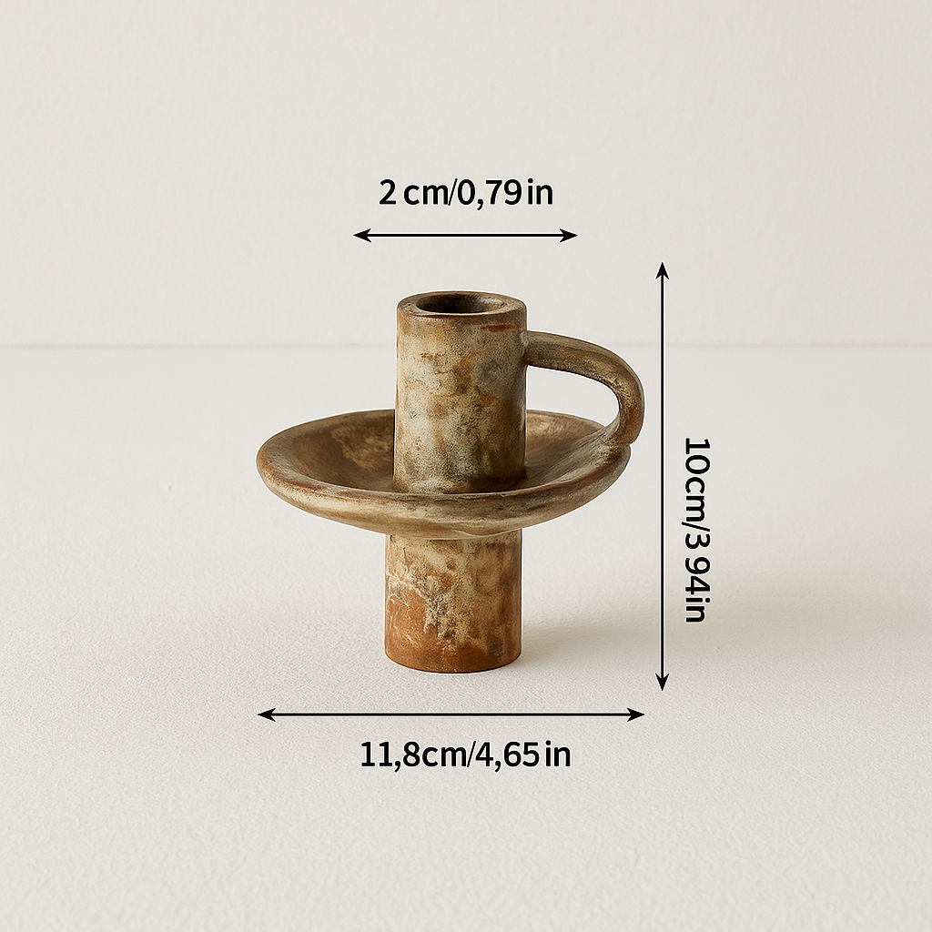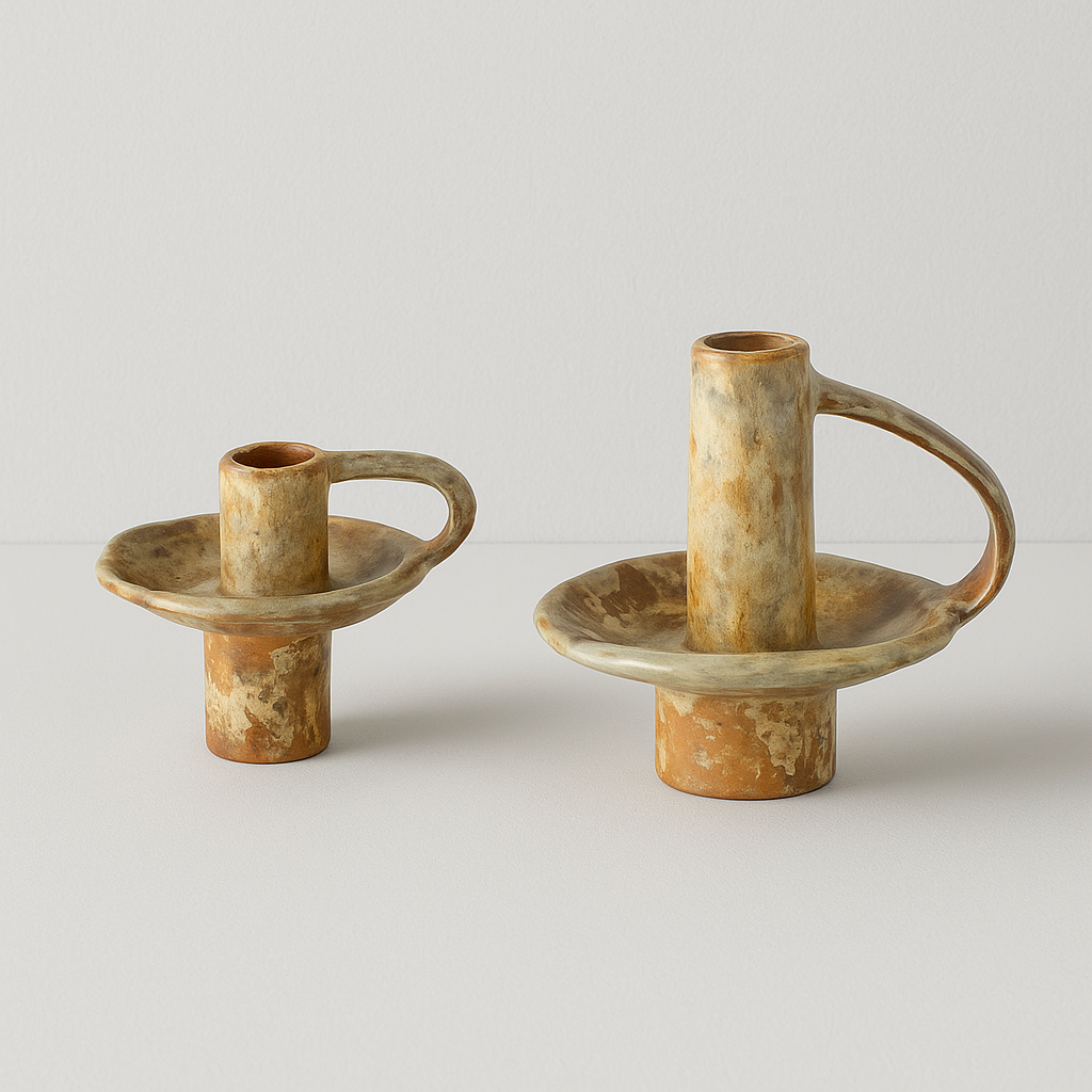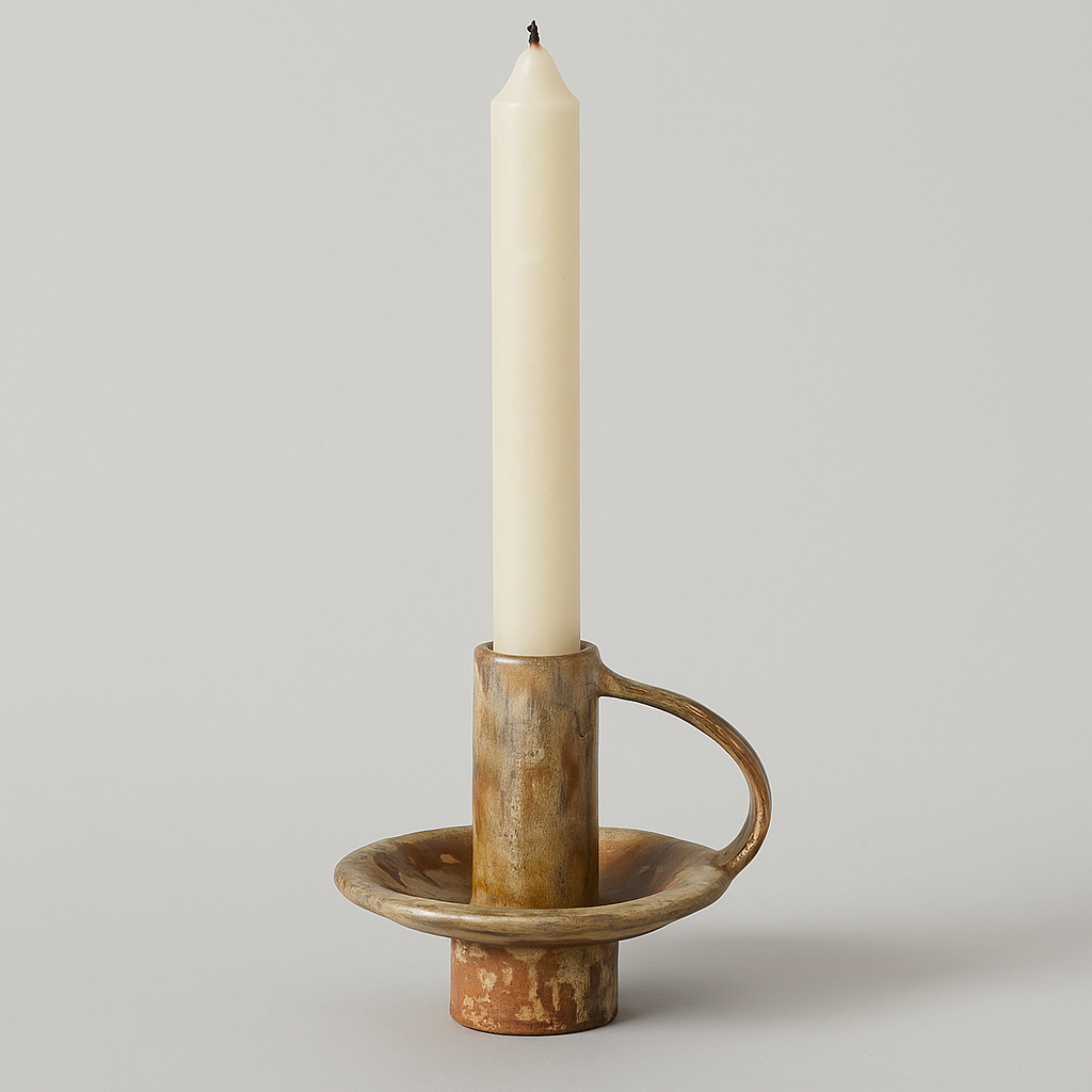 Geïnspireerd door antieke vormen en de eenvoud van ambacht, belichaamt deze keramische kandelaar met handvat de schoonheid van het pure gebaar. De unieke, bijna sculpturale vorm wordt versterkt door een gemarmerde afwerking in aardetinten, die de patina van de tijd oproept.